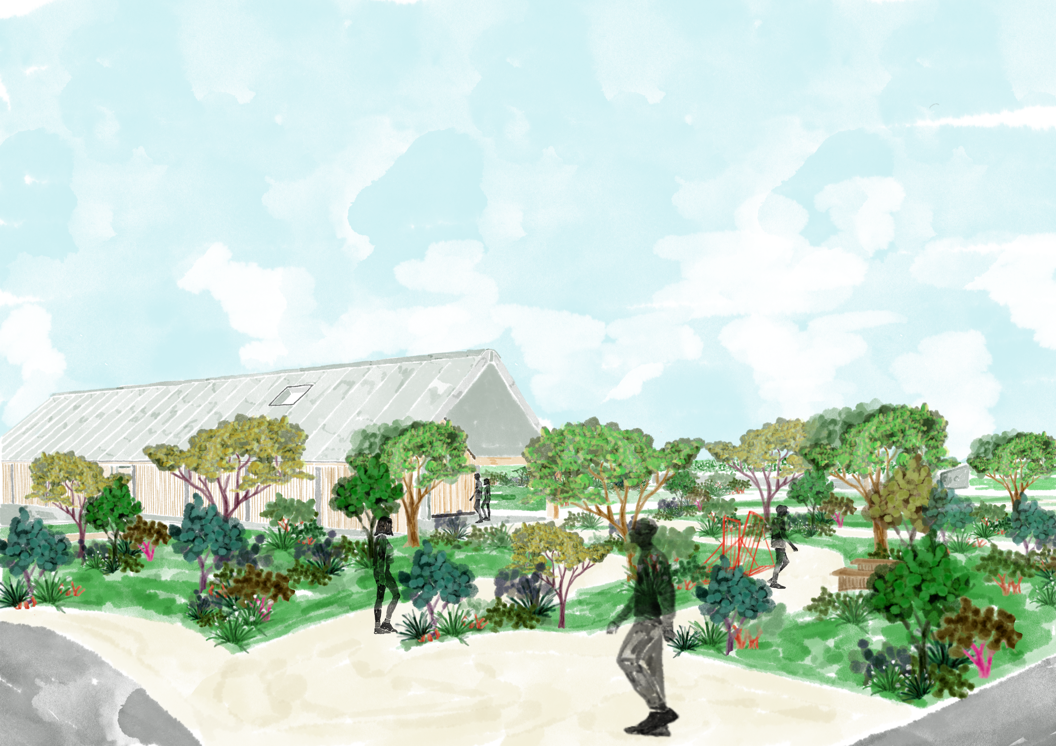 We zoned the master plan to create a cohesive rural, semi-agricultural mix of uses including animal paddocks, a productive garden, enclosed care centre garden, and public pond space with farm shop spill out.